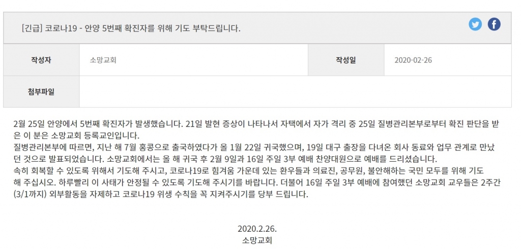 26일 소망교회는 공지사항에 올린 긴급 게시물을 통해 "2월 25일 안양에서 5번째 확진자가 발생했다"며 "21일 발현 증상이 나타나서 자택에서 자가 격리 중 25일 질병관리본부로부터 확진 판단을 받은 이 분은 소망교회 등록교인"이라고 밝혔다.