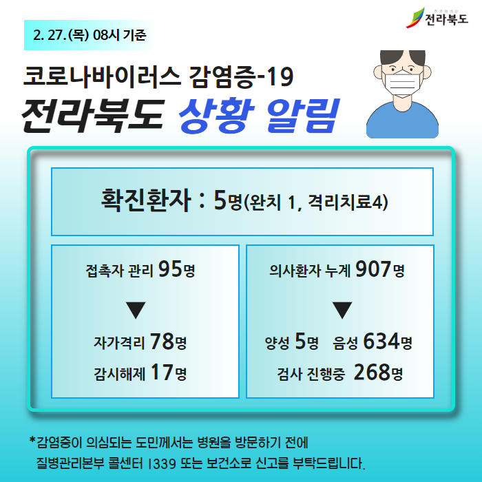 전북도청은 27일 "추가확진자는 어제(26일) 양성 판정을 받은 70대 여성의 남편(73·남)"이라며 "아들과 며느리는 음성"이라고 설명했다.