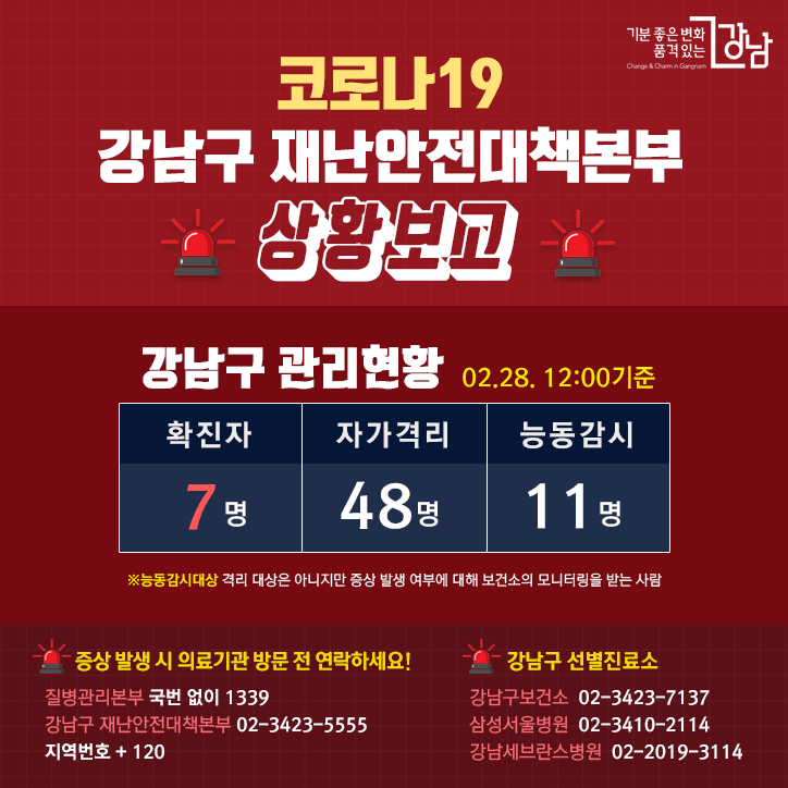 /사진=강남구 페이스북 서울 강남구에 코로나19(COVID-19) 확진자가 추가됐다. 강남구는 28일 오후 12시 기준 이 지역 코로나19 확진자가 모두 7명이라고 밝혔다. 전날 오후 6시 3명에서 추가로 4명이 발생하면서다. 강남구는 또 자가격리 중인 구민은 48명, 격리 대상은 아니지만 증상 발생 여부에 대해 보건소 모니터링을 받는 능동감시대상자가 11명이라고 밝혔다. 독자들의 PICK! '외도' 아내, 25층 매달려 협박…남편, 결국 상간남 만남 허락 "확 달라진 얼굴"...김지민 퉁퉁 붓고 멍 잔뜩 '깜짝', 무슨일? "성관계 해주면…" 성폭행 당한 여성에 경찰이 한 말 장혁 논현동 빌딩 '286억'…75억 대출받아 11년 만에 130억↑