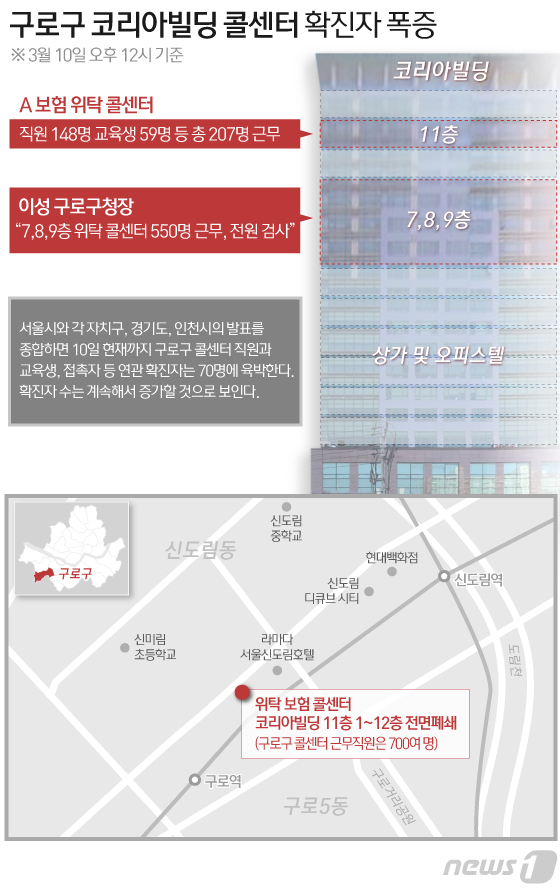서울 구로구에 위치한 보험회사 콜센터에서 코로나19 확진자가 무더기로 나온 가운데 인천 거주 확진자 13명이 지하철 1호선 구로역을 이용해 출퇴근을 한 것으로 조사됐다.
