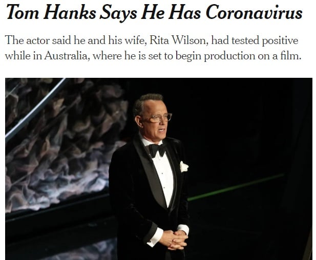 톰 행크스는 인스타그램을 통해 "저와 리타(아내)는 호주에 있으며, 우리는 감기에 걸린 것처럼 피곤함을 느꼈다. 리타는 오한이 있고 약간의 열도 있다"며 "우리는 코로나19 검사에서 양성 판정을 받았다"고 말했다.