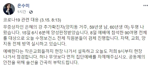 은수미 성남시장은 SNS(소셜네트워크서비스)에서 "집단 예배를 자제해 달라"며 "공동체의 안전을 위해 솔선해 줄 것을 간곡히 부탁한다"고 말했다.