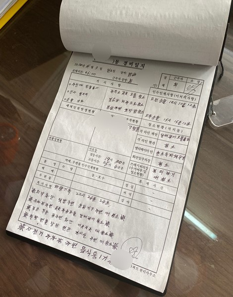11일 오후, 강북구 우이동 한 아파트. 텅 빈 경비 초소 안엔 전날 숨진 경비원 A씨가 남긴 '경비일지'가 책상 위에 놓여 있었다. 거기엔 이렇게 또박또박 쓰여진 글씨가 종이 한 장에 빼곡했다. 가로등을 언제 켜고 껐는지, 순찰은 언제 돌았는지. 그날따라 그는 유독 '대청소'를 많이 한 모양이었다. 텃밭, 운동기구, 주차장, 화단, 담장, 경비실 주변까지 다 청소했다고 적혀 있었다.