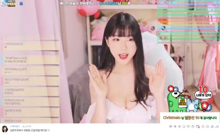 한편 지난해 11월 BJ에디린은 방송 종료 후 트위치 시스템 오류로 카메라가 켜지면서 의도치 않게 남자친구와의 사생활 영상이 공개된 바 있다.