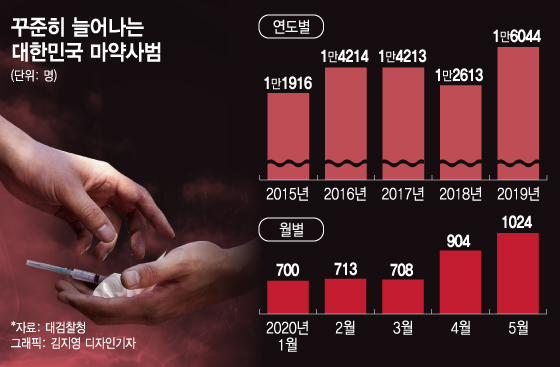 쉬운 구매 과정 탓에 마약은 생활 깊숙이 파고들었다. CJ그룹 회장의 장남, 홍정욱 전 의원의 장녀 등 유명인과 연예인에서 청소년, 주부로 마약이 퍼지고 있다. 실제 지난해 마약사범 검거는 검찰이 관련 통계를 작성한 1990년 이래 최대를 기록했다. ‘마약 청정국’이란 단어는 빛바랜지 오래다.