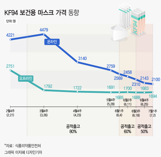 수요와 공급이 맞아 떨어지자 마스크 가격도 떨어졌다. 2월 말 오프라인 시장에서 평균 2751원이었던 KF94 보건용 마스크 가격은 3월 들어서며 약 1800원 떨어졌다. 온라인 가격은 2월 말 평균 4221원에서 현재 2100원으로 떨어졌다.