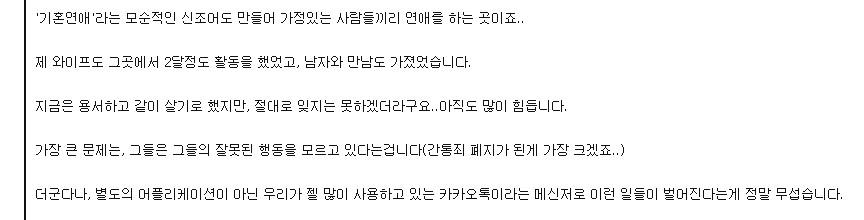 남편은 어이가 없고, 화가 많이 났다. 별거까지 했고, 딸을 생각해 결국 아내를 용서했다. 그러나 그는 "이 일을 여전히 잊지 못하고 있고, 상처가 깊고 힘들다"고 했다. 쉬이 지워지는 게 아녔다. 그러면서 "누군가에겐 호기심일지 몰라도, 누군가에겐 엄청난 상처"라며 "우리가 제일 많이 쓰는 메신저에서 이런 일이 벌어진다는 게 정말 무섭다"고 했다.