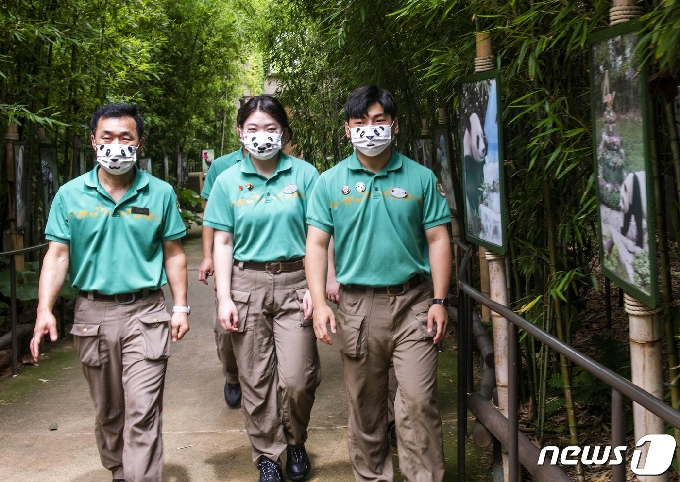 (서울=뉴스1) = 26일 경기도 용인시 에버랜드에서 판다 사육사들이 최근 태어난 아기 판다의 건강을 기원하며 직접 제작한 판다 얼굴 그림의 마스크를 쓴 채 업무를 하고 있다.