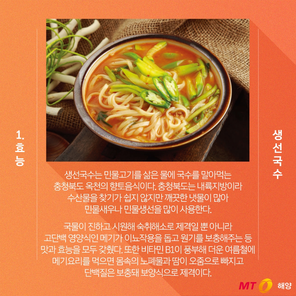 국물이 진하고 시원하기 때문에 숙취해소로 제격인 생선국수는 민물고기 중 특히 메기를 재료로 사용한다. 고단백 영양식인 메기가 이뇨작용을 돕고 원기를 보충해주는 등 맛과 효능을 모두 갖췄다. 비타민 B1이 풍부해 더운 여름철에 메기요리를 먹으면 몸속의 노폐물과 땀이 오줌으로 빠지고 단백질은 보충돼 보양식으로 제격이다.