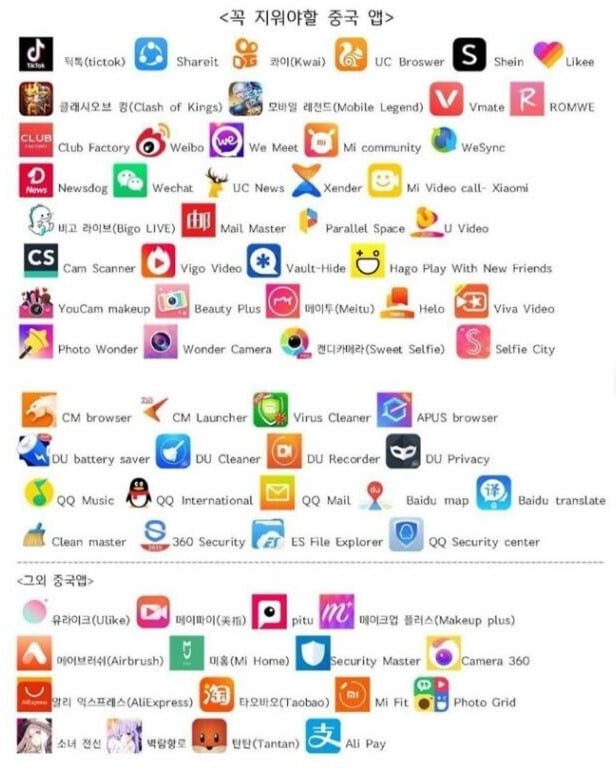 최근 온라인 커뮤니티에서는 '꼭 지워야 할 중국 앱 리스트'가 확산되고 있다. 일부 누리꾼들은 이 리스트에 올라간 중국산 앱들이 얼굴 사진이나 휴대전화 번호 등 개인정보를 무단으로 수집해 중국으로 넘긴다며 삭제를 독려하고 있다.