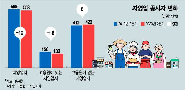 올해 2분기 말 기준 한국의 자영업 종사자는 558만명이다. 전체 근로자 5명 중 1명(20.8%)꼴로 자영업자인 셈이다. 전체 취업자 중 차지하는 비중은 비슷한 규모를 유지하고 있지만 세부지표는 다르다.