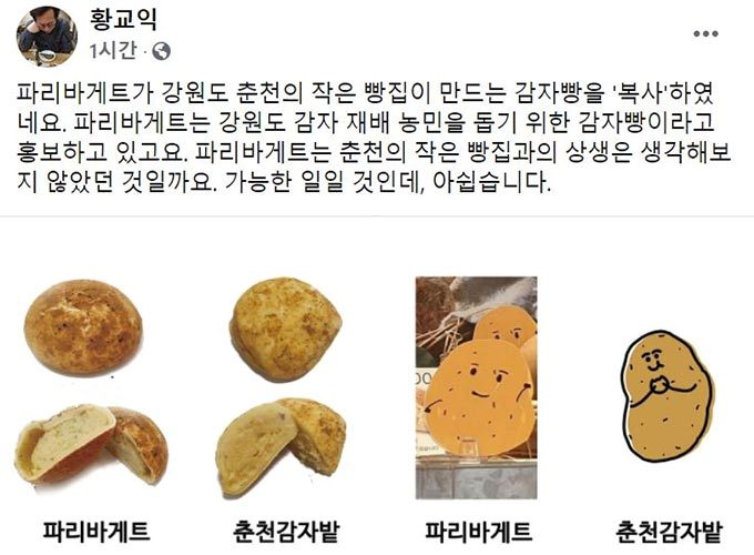 이어 맛 칼럼리스트 황교익이 이씨 글을 자신의 페이스북에 공유하고 "파리바게트가 강원도 춘천의 작은 빵집이 만드는 감자빵을 '복사'했다"며 "파리바게트는 이 빵집과의 상생은 생각해보지 않았던 것일까"라고 글을 올렸다.