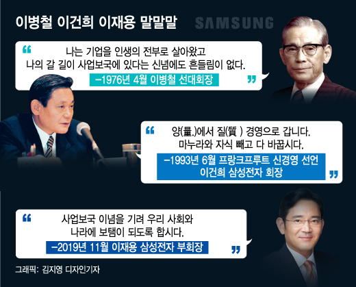 3대째를 맞는 삼성그룹 총수들은 하나같이 그룹은 물론, 한국 경제를 주도할 비전을 제시하고, 이를 실현하는 과정에서 굵직한 발자취를 남겼다. 창업주 이병철 회장은 삼성을 국내 대표기업으로 키우면서 1세대 기업가 정신의 모범을 보였고, 이건희 회장은 반도체·스마트폰·TV 등 주요사업에서 글로벌 1등 DNA를 심었다. 총수마다 시대적 과업을 달성한 만큼 3세 경영봉을 잡게 된 이 부회장의 책임감도 클 수밖에 없다.