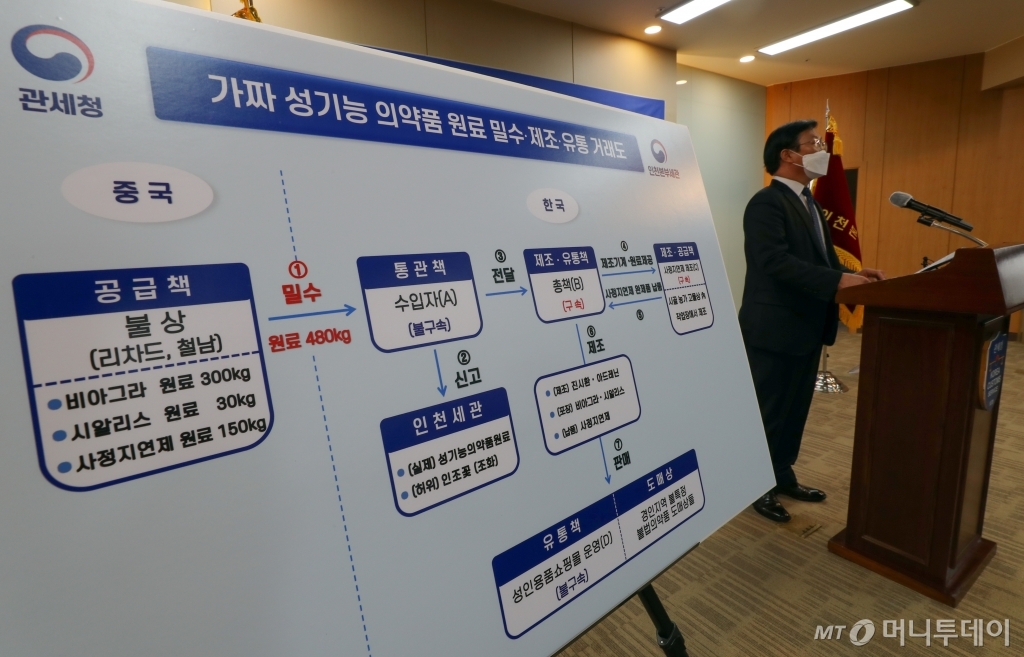 김철수 인천본부세관 조사국장이 20일 중구 인천본부세관에서 1천100억원대 가짜 발기부전치료제, 성 기능 의약품 제조 원료 등 압수품 관련 브리핑을 하고 있다. 인천본부세관은 중국으로부터 가짜 비아그라, 시알리스 등 약 25만정과 가짜 성 기능 의약품 제조원료 480kg 등을 밀수한 불법의약품 제조·유통 조직 4명을 검거하고 2명을 구속했다고 밝혔다. 독자들의 PICK! 윤미래, 뒤늦게 알려진 사망 소식..."긴 여행 떠나" 동서와 갈등→파혼 2번 아내..."조카는 남편 아이" 의심 충격 추성훈, '파격' 누드 화보 공개…"돈 안 받아, ♥야노 시호도 촬영" "남성 의사가 은밀한 곳 봤잖아" 이혼 선언…산부인과서 난동