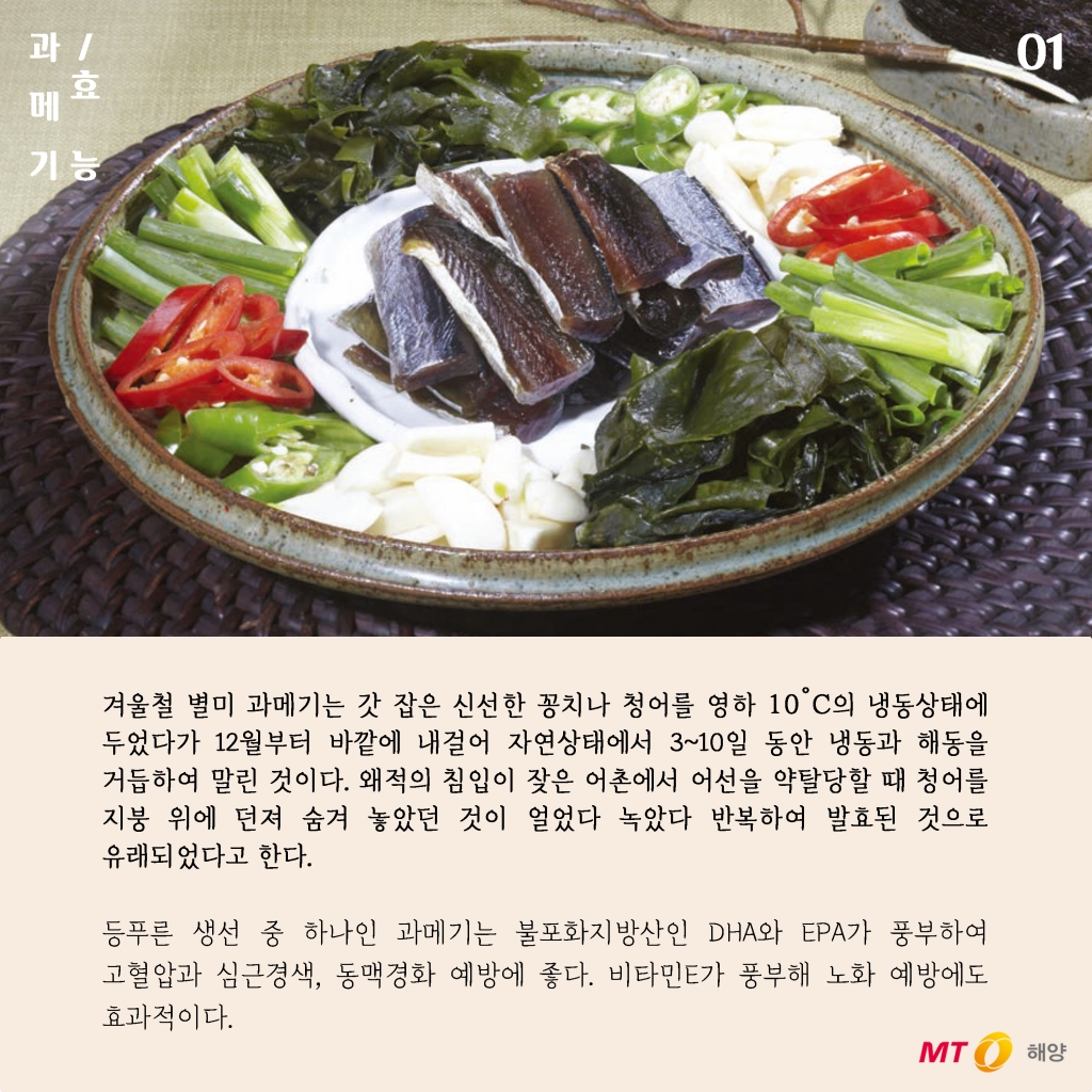 등푸른생선인 청어나 꽁치로 만드는 과메기는 불포화지방산인 DHA와 EPA가 풍부해 고혈압과 심근경색, 동맥경화 예방에 좋다. 또한 비타민 E가 풍부해 노화 예방에도 효과적이다.