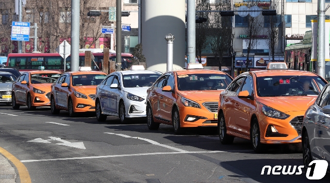 (서울=뉴스1) 황기선 기자 = 30일 오전 서울역 앞에 택시가 줄 지어 서있다.