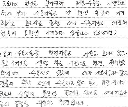 A씨는 여성 재소자들은 인권 사각지대에 놓여 있다고 호소했다. 그는 "코로나19 확산을 막기위해 남자 수용자들은 과밀수용을 지양하지만, 여성 수용자들은 여전히 5.5평 규모의 방에 8명씩 기거하고 있다"고 상황을 설명했다. 이어 "여성 재소자들과 확진 판정을 받은 남성 재소자들과 같은 건물에 층만 다르게 수용되고 있다"면서 "언제든 여자 재소자들이 감염될 수 있고, 한 명만 감염된다 하더라도 남자 수용자들처럼 순식간에 모두 감염될 위험에 있다"고 했다.