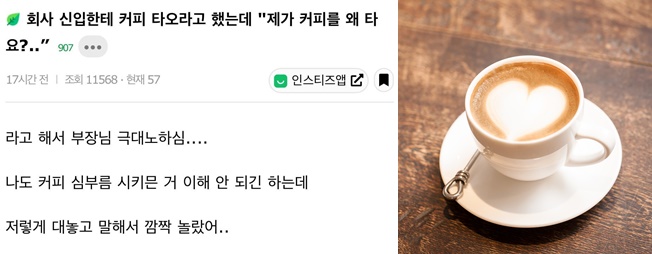 지난 24일 한 온라인 커뮤니티에는 '회사 신입한테 커피 타오라고 했는데…'라는 제목의 글이 올라왔다. 글쓴이는 "(회사 신입사원이) '제가 커피를 왜 타요?'라고 해서 부장님이 엄청 화나셨다"며 "나도 커피 심부름 시키는 거 이해 안 되긴 하는데, 저렇게 대놓고 말해서 깜짝 놀랐다"고 말했다.
