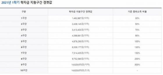 한국장학재단이 공개한 2021년 장학금 지원구간 경곗값을 보면 소득 8구간은 월 소득인정액 기준 975만2580원 이하까지 해당된다. 1년으로 계산하면 1억1703만원 수준이다. 소득인정액은 소득과 주택·자동차·예적금·주식 등 재산의 소득환산액을 더한 개념이다.