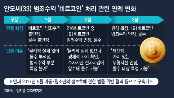 2018년 처음으로 '물리적 실체'가 없는 화폐를 무형자산으로 인정하는 판결이 나왔다. 대법원은 아동·청소년의 성보호에 관한 법률 위반 등 혐의로 기소된 안모씨(33)의 상고심에서 범죄 수익인 191BTC(비트코인)를 몰수 선고한 원심판결을 확정했다.