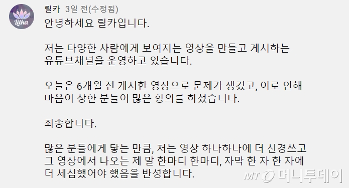 릴카는 사과문에서 "6개월 전 게시한 영상의 '오조오억개'라는 자막이 문제가 됐다는 걸 알게 됐다"며 "영상을 비공개 처리했으며 이 일로 불편함과 표현의 부적절함을 느끼셨을 분들에게 사과드린다"고 밝혔다.