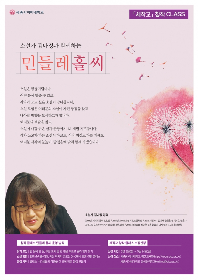 세종사이버대학교 문예창작학과가 오는 31일부터 13주 간 '세작교(세종사이버대 창작교실)' 온라인 창작 클래스 '소설가 김나정과 함께하는 민들레 홀씨'를 운영한다.