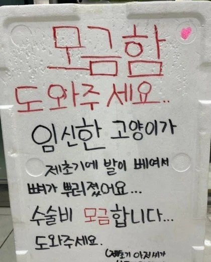 기숙사 내에 설치된 모금함에도 "임신한 고양이가 제초기에 발이 베여서 뼈가 부려졌다. 수술비 모금한다. 도와달라"는 글과 함께 괄호로 '제초기 아저씨가 나몰라라 해요'란 글이 적혀 있다.