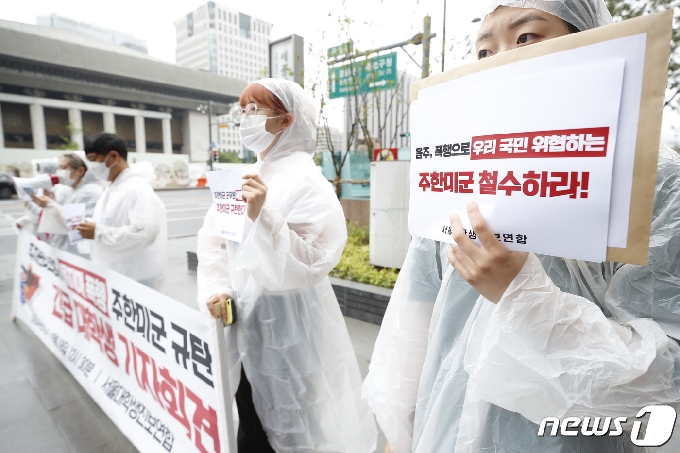 이날 참가자들은 "지난 12일 홍대 거리 한복판에서 주한미군 군무원이 주차관리 노동자를 마구잡이로 폭행한 사건이 발생했다"면서 "한미SOFA(주한미군지위협정)상 범죄를 저지른 미군에 대한 신병인도가 되지 않아 초등수사가 방해 받고 있다"고 주장했다. 2021.6.18/뉴스1