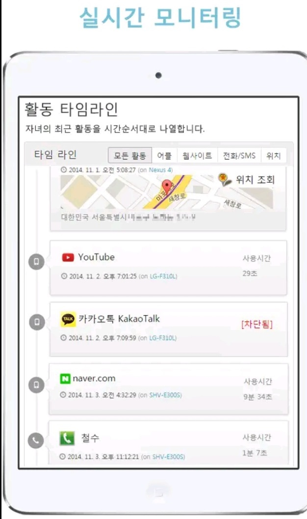 100만건 이상 다운로드된 한 '관리 앱'을 실제로 사용해 본 결과 자녀의 휴대전화를 직접 만지지 않아도 어떤 앱을 무슨 용도로 사용했는지, 몇 초간 그 앱에 머물렀는지까지를 부모의 휴대전화로 들여다볼 수 있다. 자녀의 통화내역이나 메신저 사용 이력, 웹사이트 방문 기록도 부모의 휴대전화에 실시간으로 표시된다.