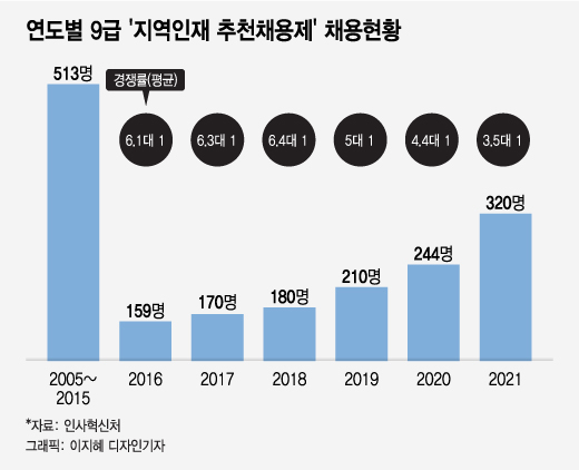 바늘구멍에 통과하는 만큼 어렵다는 공무원 시험 통념과 달리 경쟁률이 낮단 점에서다. 인사처에 따르면 연도별 지역인재 선발인원은 매년 지속 증가하는 추세다. 지역인재 9급은 △2016년 159명 △2017년 170명 △2018년 180명 △2019년 210명 △2020년 244명을 뽑았다. 지난 11일 필기시험을 치른 올해는 320명으로 역대 최대 규모로 선발한다.