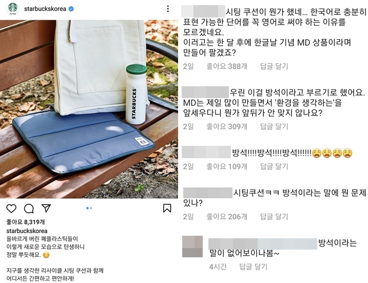 스타벅스코리아 공식 사회관계망서비스(SNS)에는 외국어 남용이 지나치다는 항의 댓글이 연일 이어지고 있다. 소비자들은 "그냥 '방석'이라고 하면 안 되는 거냐", "한국어로 충분히 표현 가능한 단어를 꼭 영어로 써야 하냐", "'재활용 방석'이 글자 수도 훨씬 적고 알아보기 쉽다" 등의 반응을 보였다.