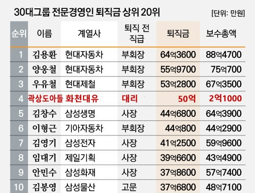 곽씨는 50억 원으로 4위를 차지했다. 퇴직 전 직급은 대리다. 20위 안에 오른 이들이 모두 부회장, 대표이사, 사장, 부사장, 또는 최고경영자(CEO)를 거친 고문이라는 점을 고려하면 매우 이례적인 상황이다.