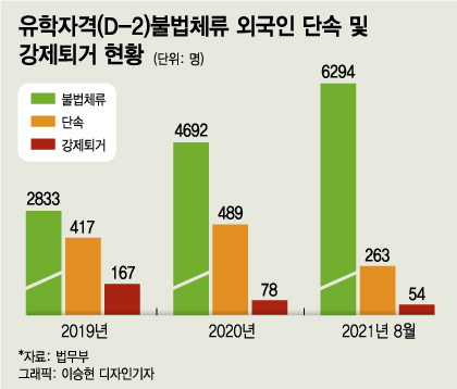 문제는 유학비자가 취업비자보다 발급이 간단해 대학이 불법체류자의 국내 유입 통로로 활용될 수 있다는 점이다. 학위과정 외국인 유학생은 2019~2021년 3년간 20% 증가했으나, 같은 기간 불법체류자가 된 유학생들은 122% 이상 증가했다. 대학들이 재정난을 해결하기 위해 유학생 유치에만 급급할 뿐 유학생 관리 역량이 급격히 추락하고 있다는 지적이 나온다.