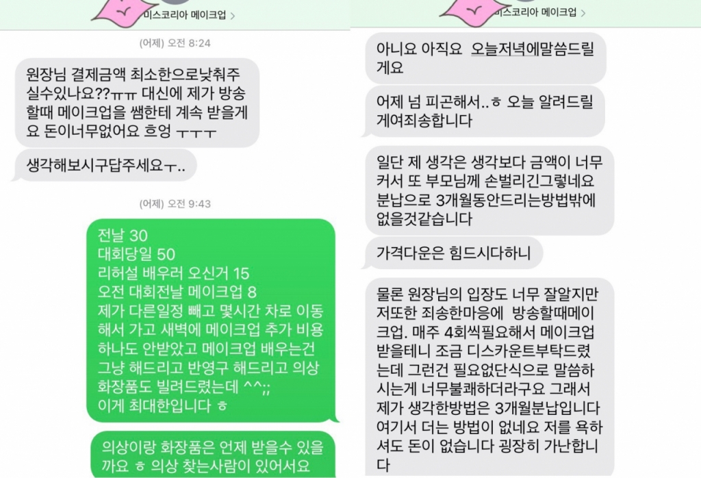 A씨는 B씨에게 지난 9월 13일과 27일 연락해 결제를 요청했지만 B씨는 결제 방식 변경 등으로 이유로 결제와 의상 반납 등을 미뤘다. A씨는 "B씨가 한 달 이상 결제를 미룬 것도 모자라 갑자기 비용 할인을 요구했고, 제가 최대한 할인해서 100만원만 받겠다고 제안했는데도 B씨는 적반하장으로 '불쾌하다'는 문자를 보냈다"며 "할인해주면 방송할 때 메이크업을 주 4회 받으려고 했다고 마치 아량을 베푼다는 듯이 말하며 3개월 분납하겠다는 통보를 했다"고 밝혔다.