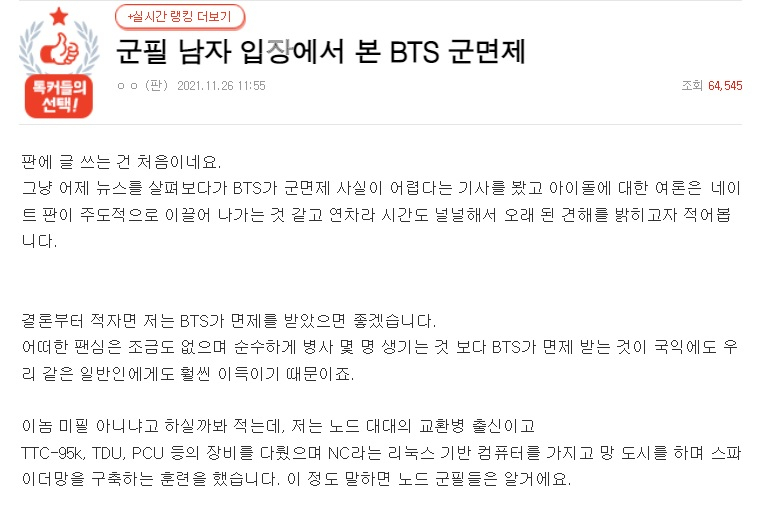 지난 26일 온라인 커뮤니티 네이트판에는 '군필 남자 입장에서 본 BTS 군면제'라는 제목의 글이 올라왔다. 군필자라고 밝힌 작성자 A씨는 "결론부터 적자면 BTS가 면제를 받았으며 좋겠다"고 했다.