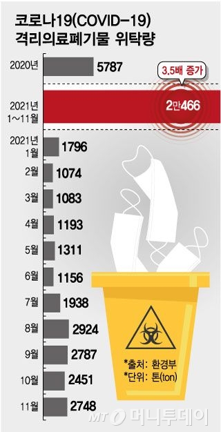 확진자 1명당 하루 5kg 가량의 의료폐기물을 배출한다. 지난 9월까지는 자가격리자가 격리기간 동안 사용한 물품 역시 격리의료폐기물로 간주됐다. 하지만 환경부는 지난 10월부터 재택치료자나 자가격리자에게서 발생하는 폐기물을 격리 해제 뒤에 일괄 소독해서 일반폐기물로 배출하도록 했다. 10월부터는 격리의료폐기물 통계에 자가격리자나 재택치료자가 내놓는 쓰레기는 제외됐다는 얘기다. 그럼에도 격리의료폐기물 위탁량은 여전히 증가추세다.