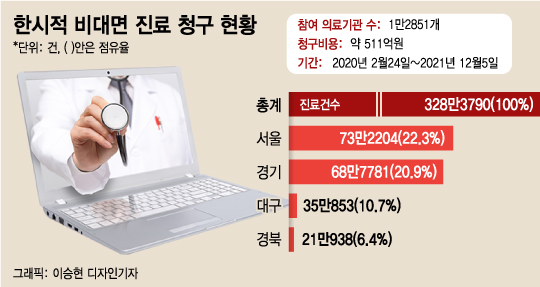 22일 보건복지부에 따르면 지난해 2월24일부터 이번 달 5일까지 누적된 비대면 진료 청구 건수는 328만3790건이다. 청구된 진료 비용은 약 511억원이다. 지금까지 1만2851개의 의료기관이 참여했다.