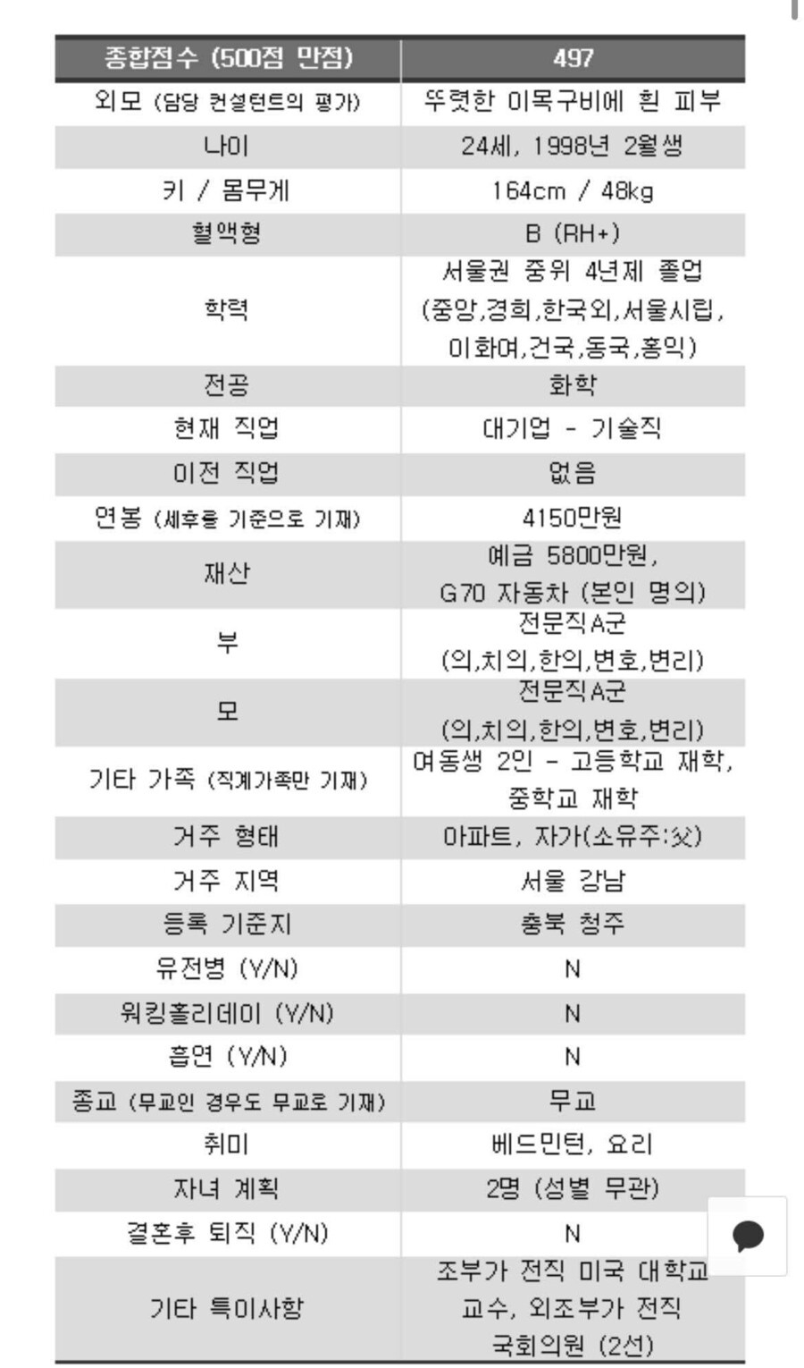 해당 표에는 △뚜렷한 이목구비에 흰 피부 △키 164cm △몸무게 48kg △혈액형 B형 △서울 중위권 4년제 대학 화학과 졸업 △대기업 기술직 종사 △연봉 세후 4150만원 △예금 5800만원 △본인명의 자동차 G70 소유 △아버지 명의 서울 강남 아파트 거주 △취미는 배드민턴, 요리 등이라고 적혀 있다.