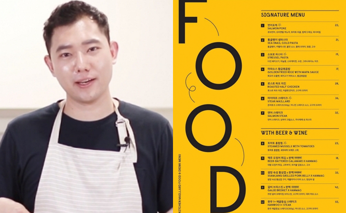 가장 저렴한 메뉴는 마파소스황금볶음밥으로 1만 7000원이다. 이어 소보로 파스타(1만 9000원), 통골뱅이 냉파스타(2만 1000원), 로스트 하프 치킨(2만 8000원), 연어 스테이크(3만2000원), 쌈장 숙성 통삼겹X한맥(3만3000원), 마이야르 스테이크(3만6000원), 갈비 브리스킷X한맥(4만2000원) 등 순이다.