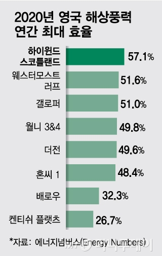 이 발전단지는 영국 풍력단지 중에서도 가장 높은 효율을 내는 것으로 유명하다. 영국 에너지 통계 앱 '에너지 넘버스'에 따르면 2020년 하이윈드 스코틀랜드의 연간 최대 효율은 57.1%에 달했다. 이 기간 하이윈드 스코틀랜드 최대 발전 용량(30㎿)의 57.1%에 해당하는 전력이 생산됐다는 의미다. 풍력발전은 바람이 너무 약해도, 강해도 작동되지 않기에 일반적인 효율이 30~40%대에 그친다.