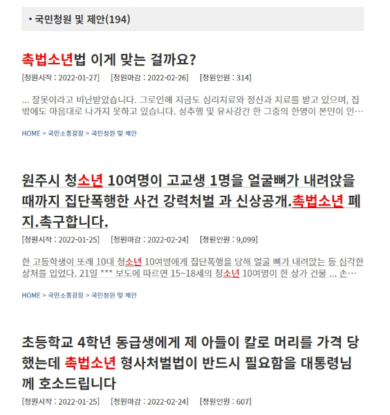 최근 몇 년 사이 '촉법소년' 범죄가 계속 증가하자 소년법을 개정해야 한다는 목소리도 덩달아 높아지고 있다. 청와대 국민청원 게시판에는 지난 한달 사이 관련 청원만 6개가 올라와 있다. 이들은 모두 촉법소년 기준 연령을 낮추거나 관련 법을 폐지해야 한다고 주장한다.