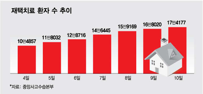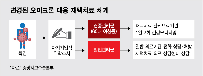 이날 코로나19 재택치료 환자는 17만4177명이다. 총 관리 가능 인원은 18만9000명, 가동률은 92%다. 재택치료 역량이 소진되자 정부는 대책을 발표했다. 위험하지 않은 일반관리군 환자는 별도 모니터링을 하지 않기로 한 것이다. 이날부터 60세 이상 등 집중관리군 환자만 의료기관으로부터 1일 2회 진찰받는다.