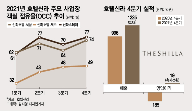 13일 관련업계에 따르면 국내 대형 토종 호텔업체들의 실적이 상승세다. 호텔신라는 지난해 4분기 호텔·레저 부문에서 전년 동기 대비 23% 증가한 1225억원의 매출액을 기록했다. 영업이익은 19억원으로 흑자전환했다. 2020년 1분기부터 시작한 적자기조를 지난해 3분기 끊어낸 이후 연속 분기 흑자를 내며 완연한 회복세를 보이고 있다.
