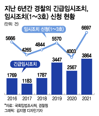 국회입법조사처와 경찰청에 따르면 임시조치와 긴급임시조치 신청 건수는 지난해 큰 폭으로 늘었다. 접근금지에 해당하는 임시조치 1~3호는 2020년 4003건에서 지난해 6697건으로 약 1.5배 늘었다. 긴급임시조치도 2020년 2567건에서 지난해 3864건으로 늘었다.