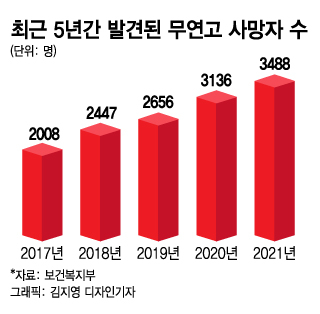15일 보건복지부 통계에 따르면 고독사로 추정 가능한 무연고 사망자 수는 2019년 2656명에서 코로나19가 발생한 2020년 3136명, 지난해 3488명으로 늘었다.