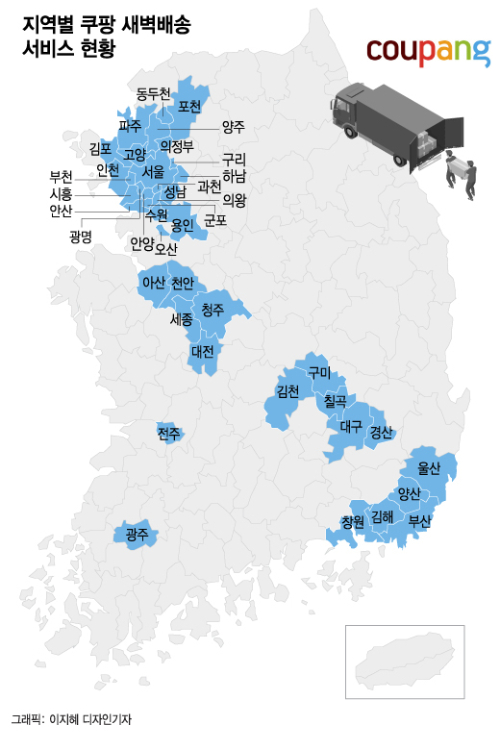 머니투데이 조사에 따르면 전 국토의 84%에서 쿠팡 등의 새벽배송이 이뤄지지 않고 있다. 정소연 교보증권 연구원은 "온라인 전환 가속화에 따라 2020년 2조5000억원 규모의 새벽배송 시장은 2023년 11조9000억원까지 성장할 전망"이라고 말했다. 하지만 확대된 시장의 혜택이 지방에는 온전히 돌아가지 않고 있는 상황이다.