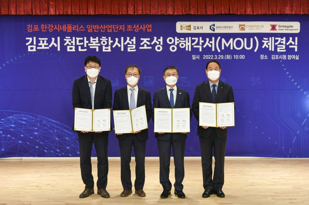 지난 29일 김포시와 스마일게이트자산운용㈜, 김포도시관리공사, ㈜한강시네폴리스개발과 미래성장산업 육성 및 산학 상생협력을 위한 첨단복합시설 조성 양해각서(MOU)를 체결했다.