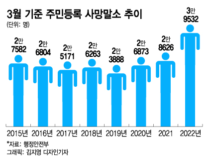 5일 행정안전부에 따르면 지난달 주민등록 기준 사망말소 인구는 3만9532명으로 집계됐다. 사망말소는 가족관계등록법에 따라 사망신고가 이뤄진 뒤 가족관계등록부에서 말소하는 것을 의미한다. 사실상 신고일 기준의 사망자수와 동일한 개념이다.