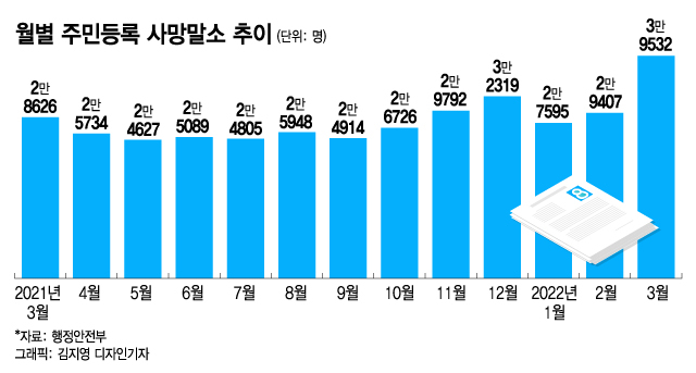 지난달 사망말소 인구는 지난해 3월(2만8626명)보다 38% 늘었다. 사망통계는 계절적 요인의 영향을 받기 때문에 통상 전년동기로 비교한다. 사망통계를 집계한 이후 전년동기 대비 사망자수가 이처럼 급증한 것은 처음이다. 월별 기준 사망자수도 역대 최대다.