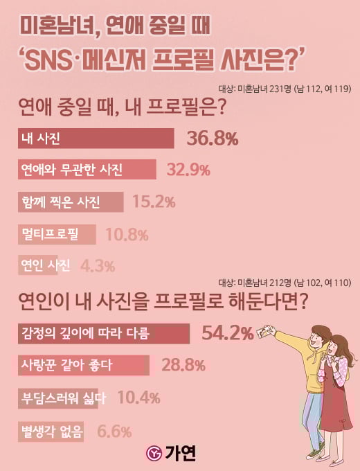 이에 결혼정보회사 가연은 최근 연애와 메신저 프로필 사진에 대한 미혼남녀들의 생각을 알아봤다.